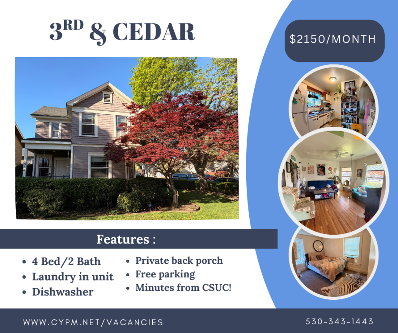 Come be part of the classic 3rd & Cedar Townhomes community! This large 4 bedroom, 2 bathroom home offers the perfect combination of space, comfort, and convenience in an unbeatable location just two blocks from campus — giving you more time to relax before class.